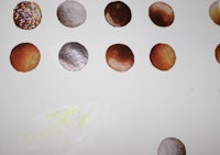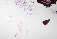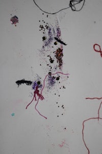 a mix of paper cut outs from magazines, glitter, glue, dried paint, fabrics